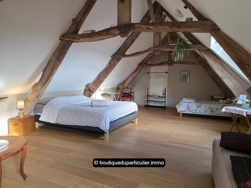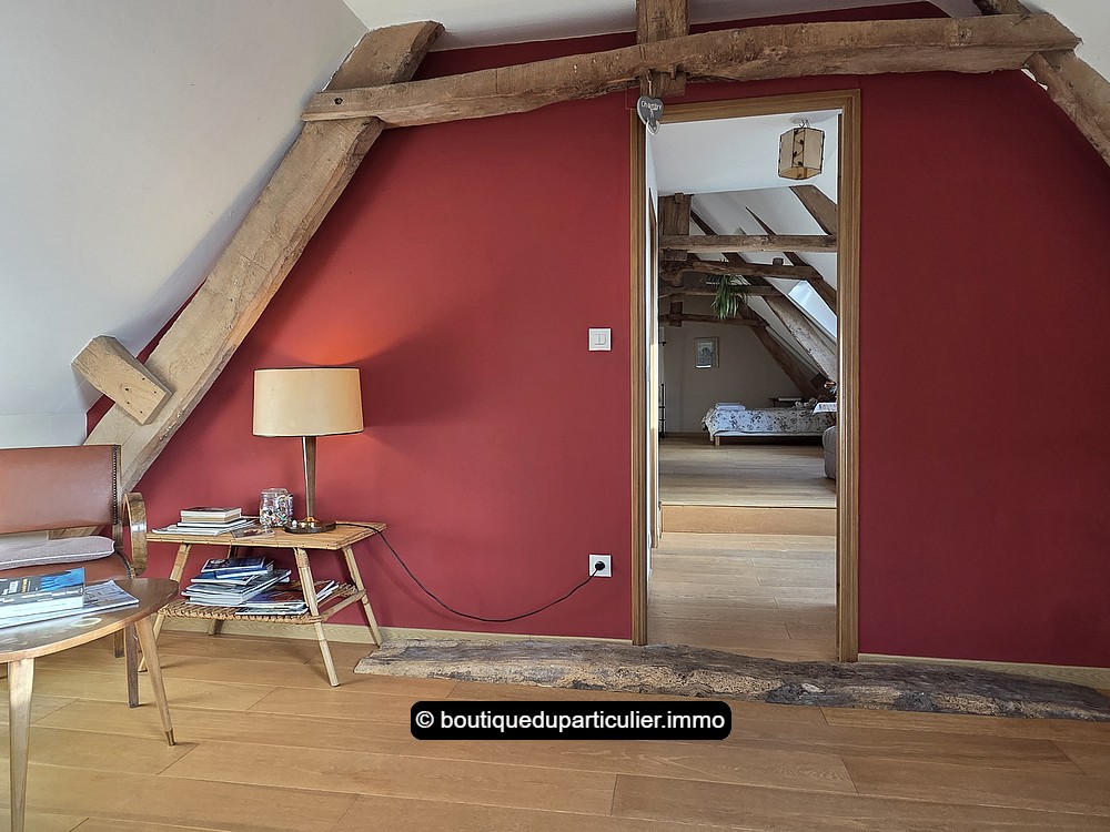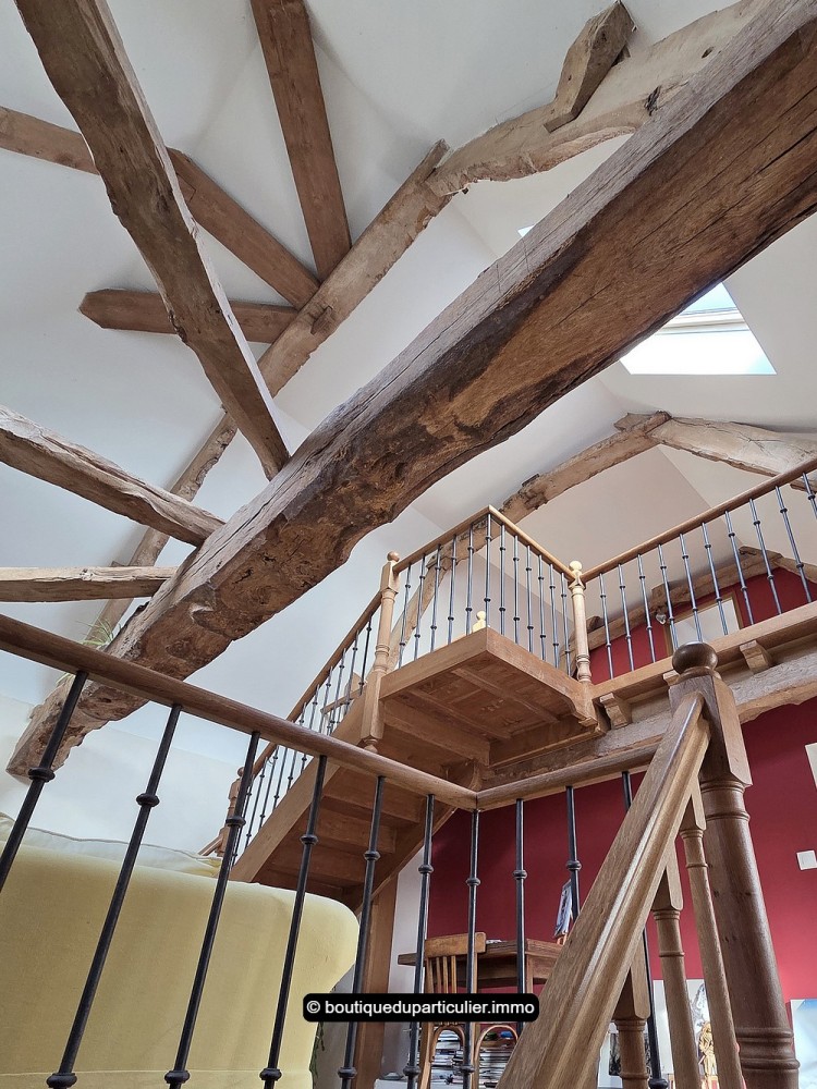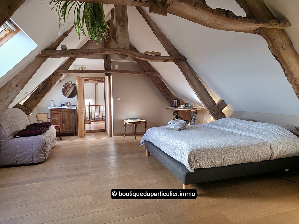 A l'étage, un magnifique salon cathédrale, avec au-dessus une très grande chambre mansardée d'env. 40 m² au sol (env. 20 m² loi Carrez) avec salle d'eau privative (douche/WC).