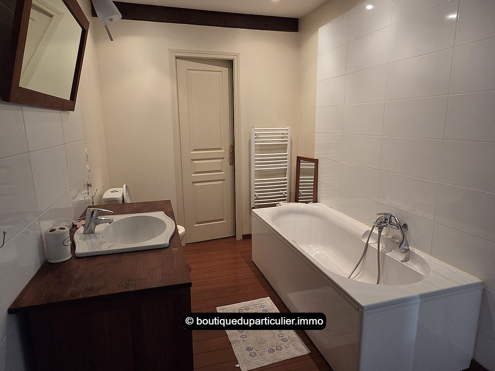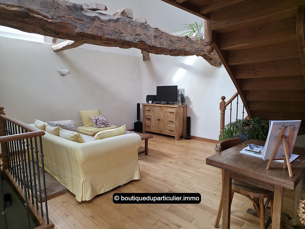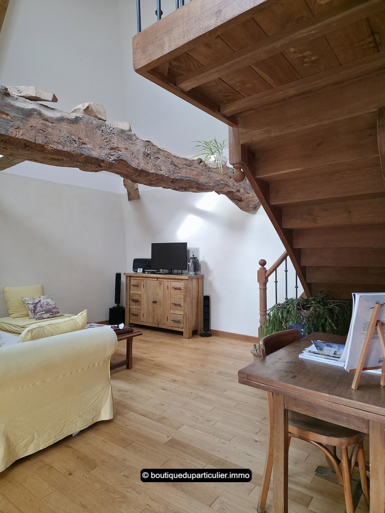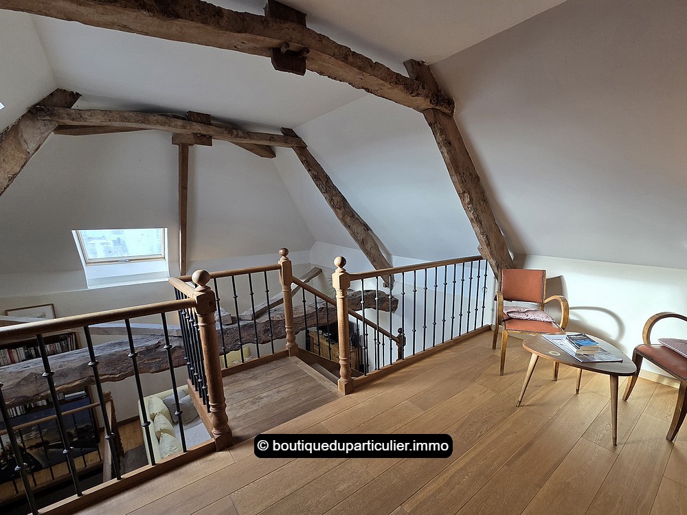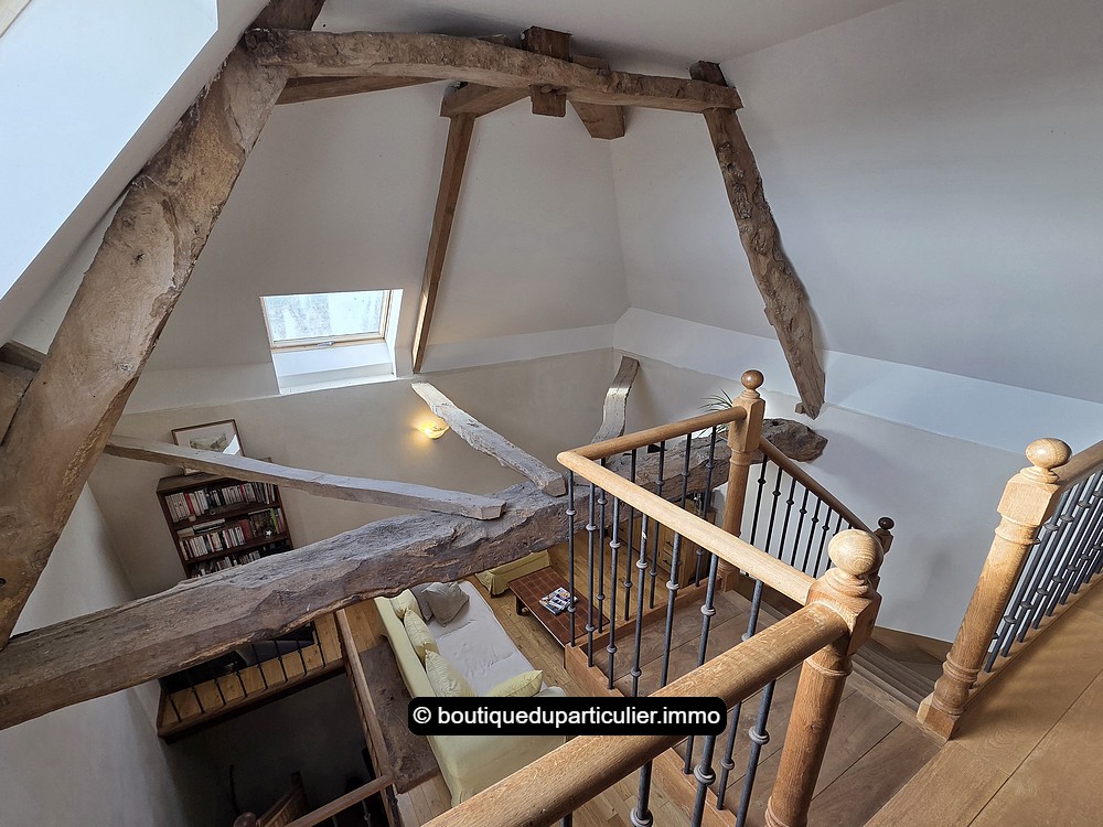 A l'étage, un magnifique salon cathédrale, avec au-dessus une très grande chambre mansardée d'env. 40 m² au sol (env. 20 m² loi Carrez) avec salle d'eau privative (douche/WC).