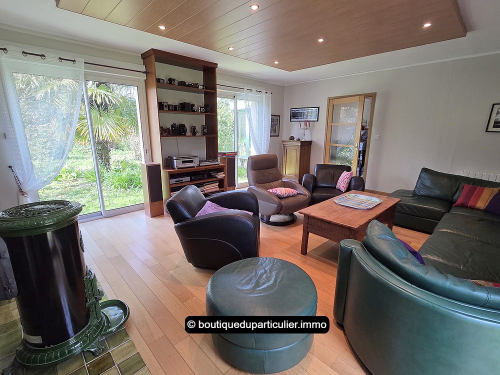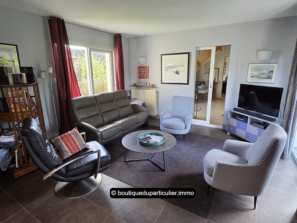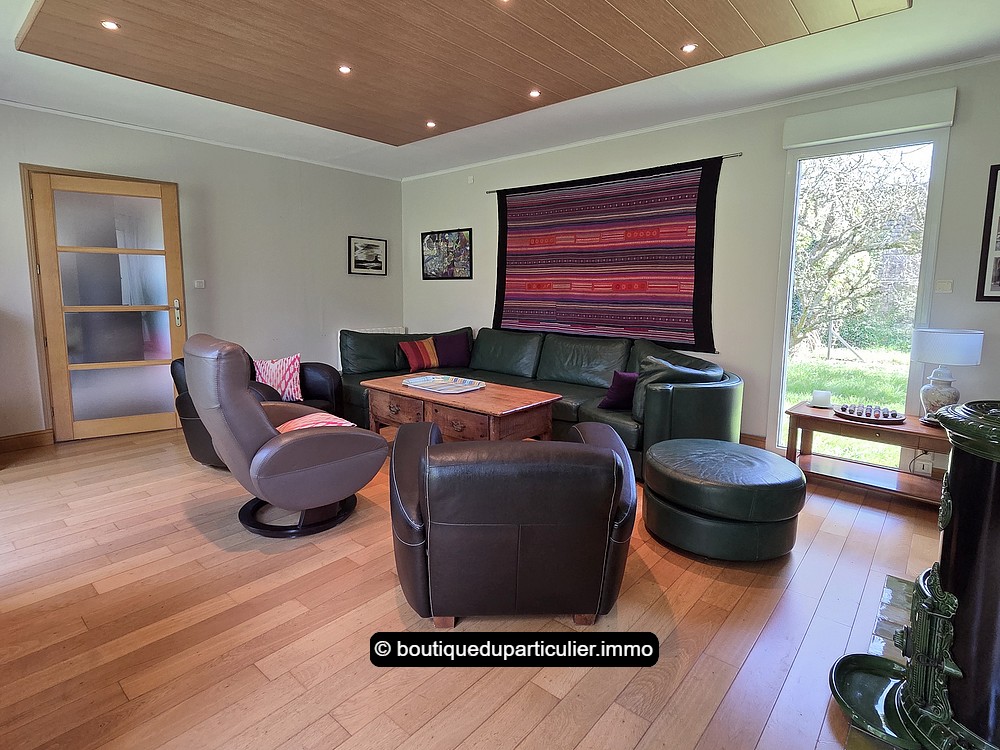 Une première partie de la maison a été construite en 1991, elle comprend une entrée, un séjour/salon d'env. 40 m² avec cuisine ouverte aménagée et équipée, une suite parentale composée d'une grande chambre et d'une salle d'eau privative, une buanderie, et un WC séparé.