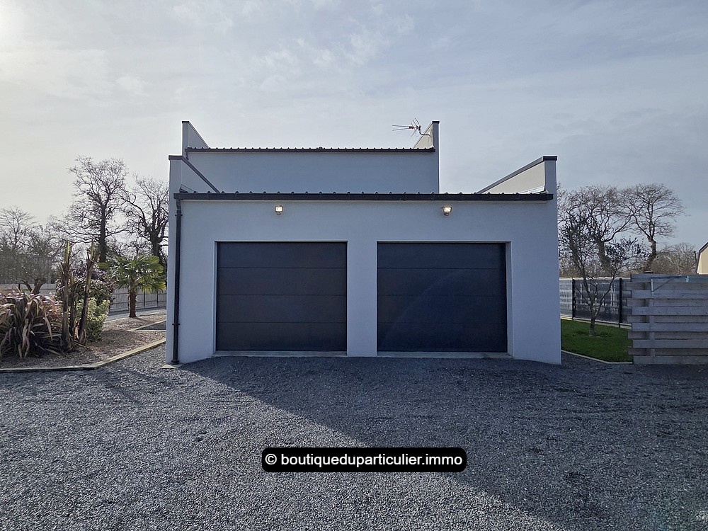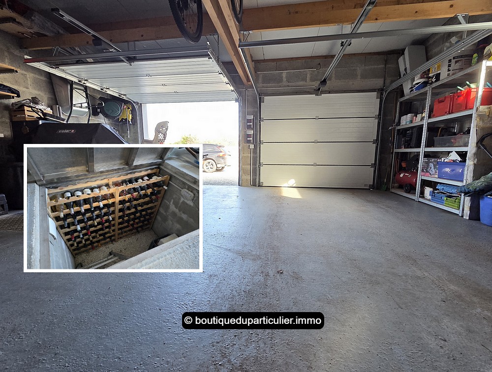 Grand double garage attenant d'env. 42 m² avec 2 portes motorisées et cave à vin enterrée.