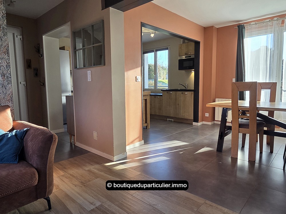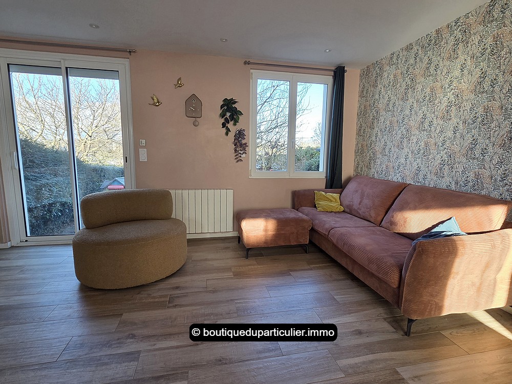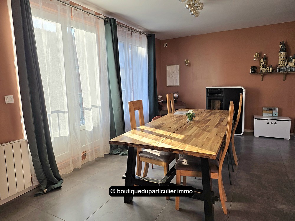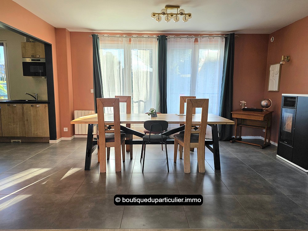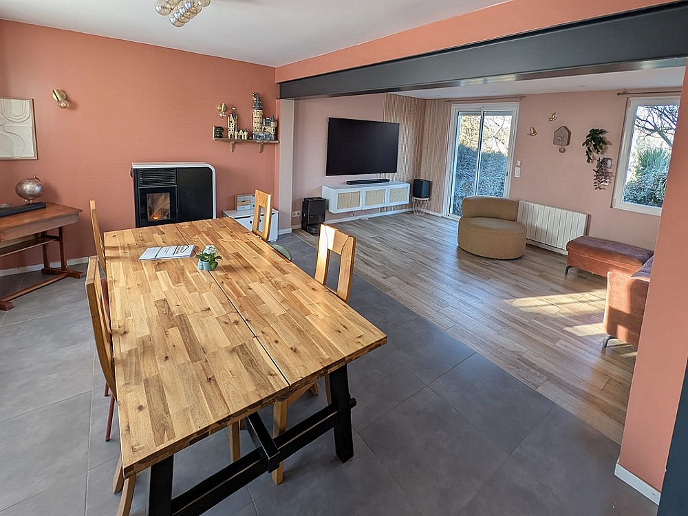L'espace de vie s'accède par un perron extérieur, vous y trouverez une entrée ouverte sur une grande pièce de vie d'env. 45 m² avec cuisine moderne équipée, salle à manger et salon. L'ensemble agrémenté d'un poêle à granulés qui chauffe également l'étage.