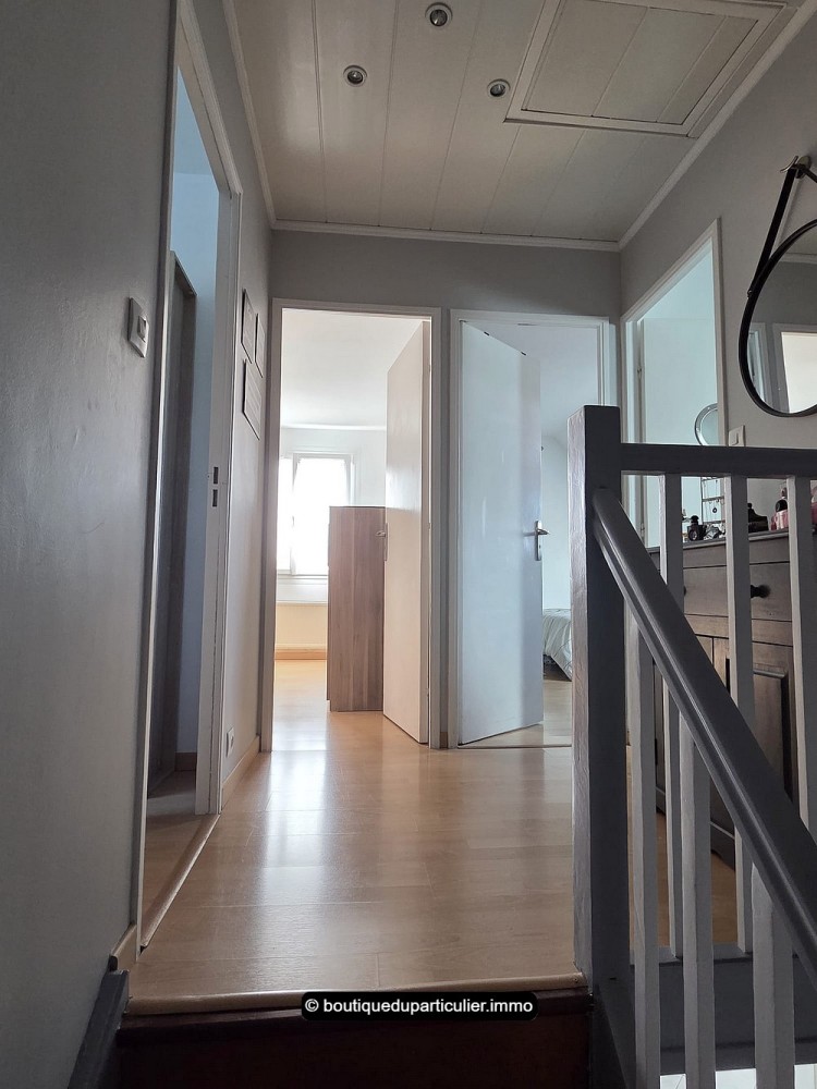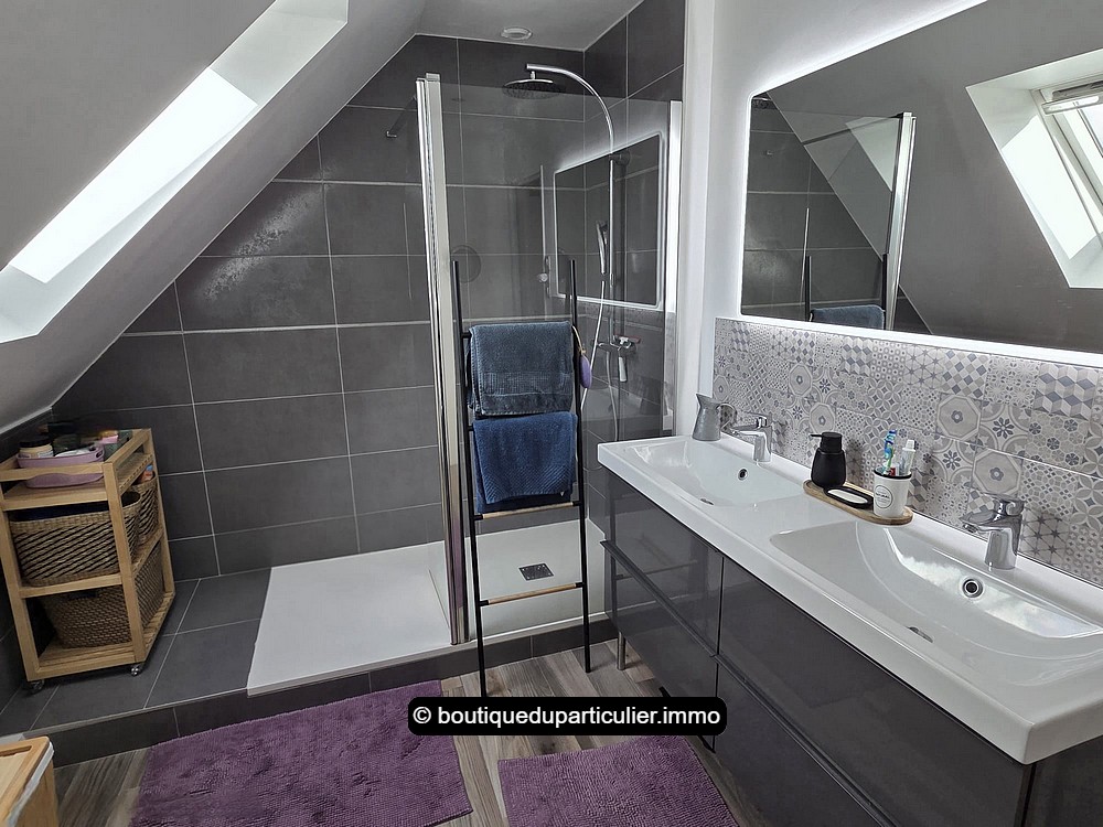 A l'étage, un palier distribue 3 chambres mansardées d'env. 11/12 m² au sol chacune (une inférieure à 9 m² Loi Carrez), et une salle d'eau avec grande douche, meuble double vasque et WC.