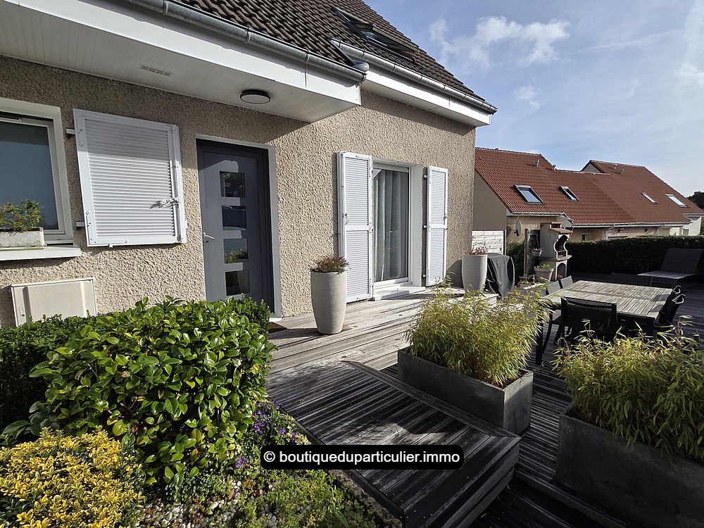 Parcelle totale de 563 m² comprenant un parking, une grande terrasse bois en façade, et un jardin d'agrément sur l'arrière légèrement en pente.