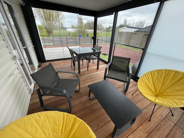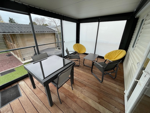 En prolongement du mobil-home, une terrasse a été aménagée avec une pergola bioclimatique de 12 m² fermée entièrement avec des baies vitrées coulissantes et de rideaux roulants.