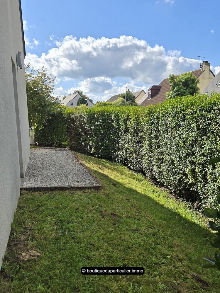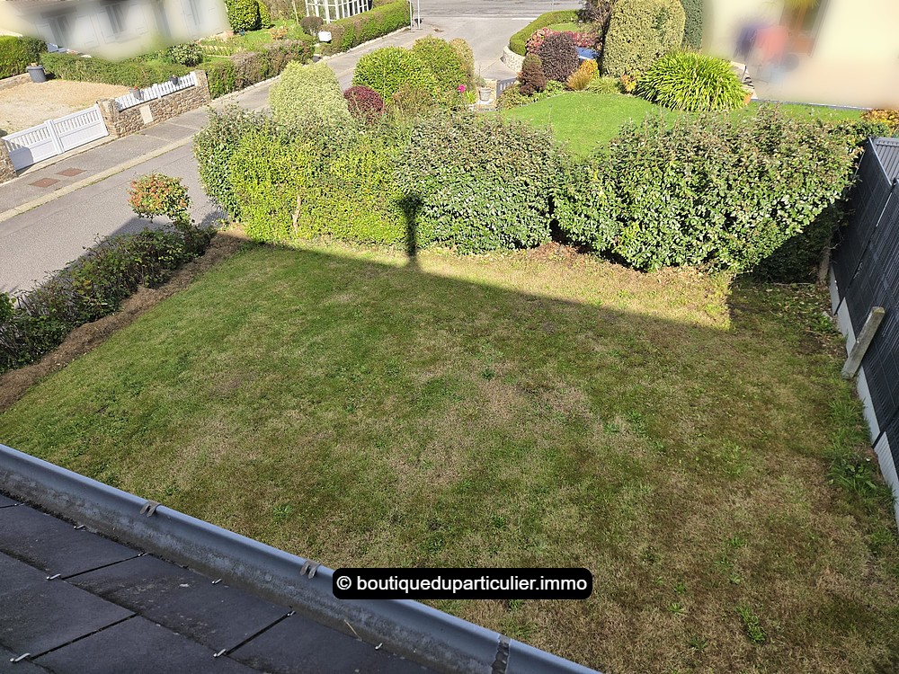 Parcelle de 235 m² : jardin et stationnement devant la maison.