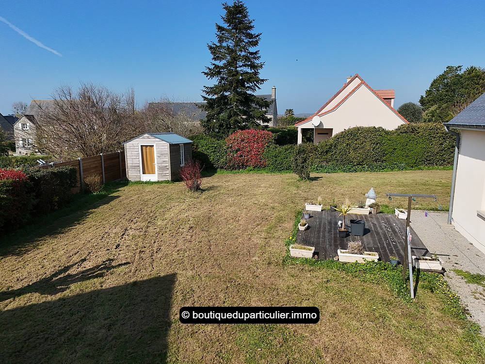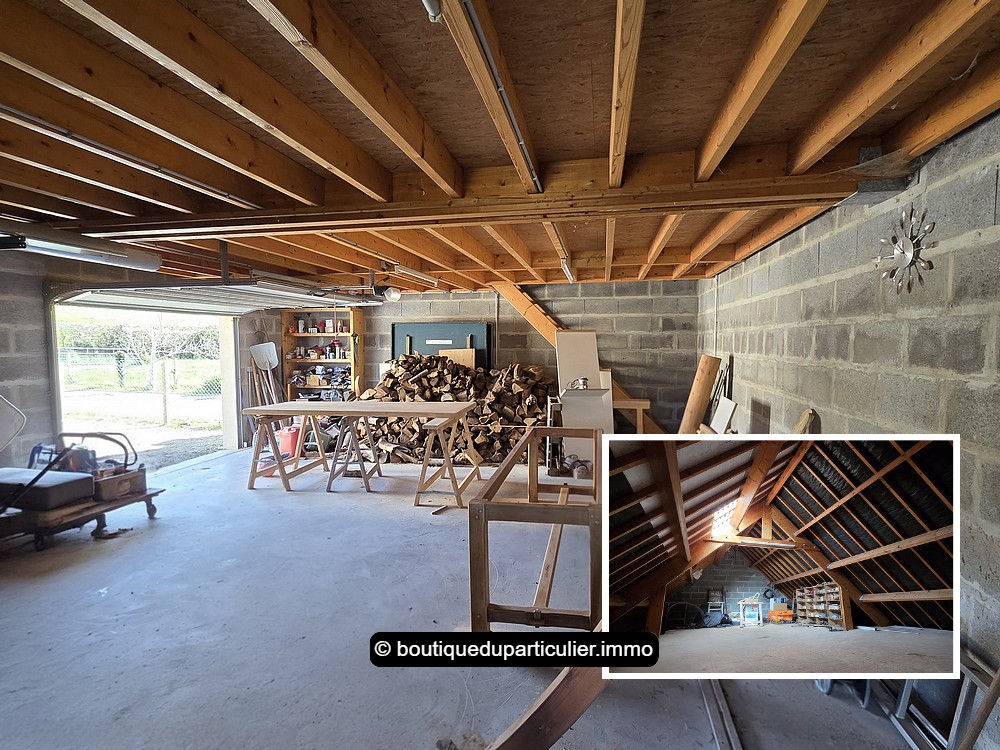 Le jardin, plat et clos, entoure la maison et accueille un second grand garage d’environ 65 m² avec doubles portes et étage, pouvant être transformé en gîte sous réserve d’autorisations administratives.