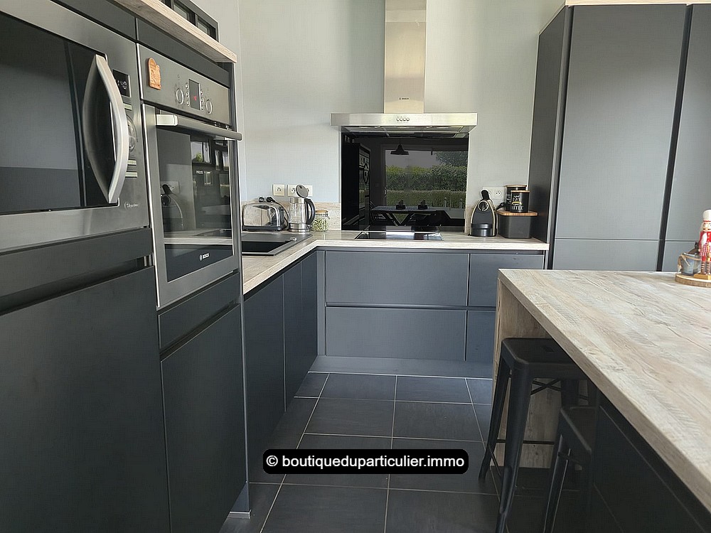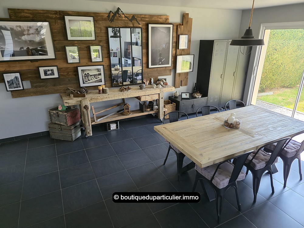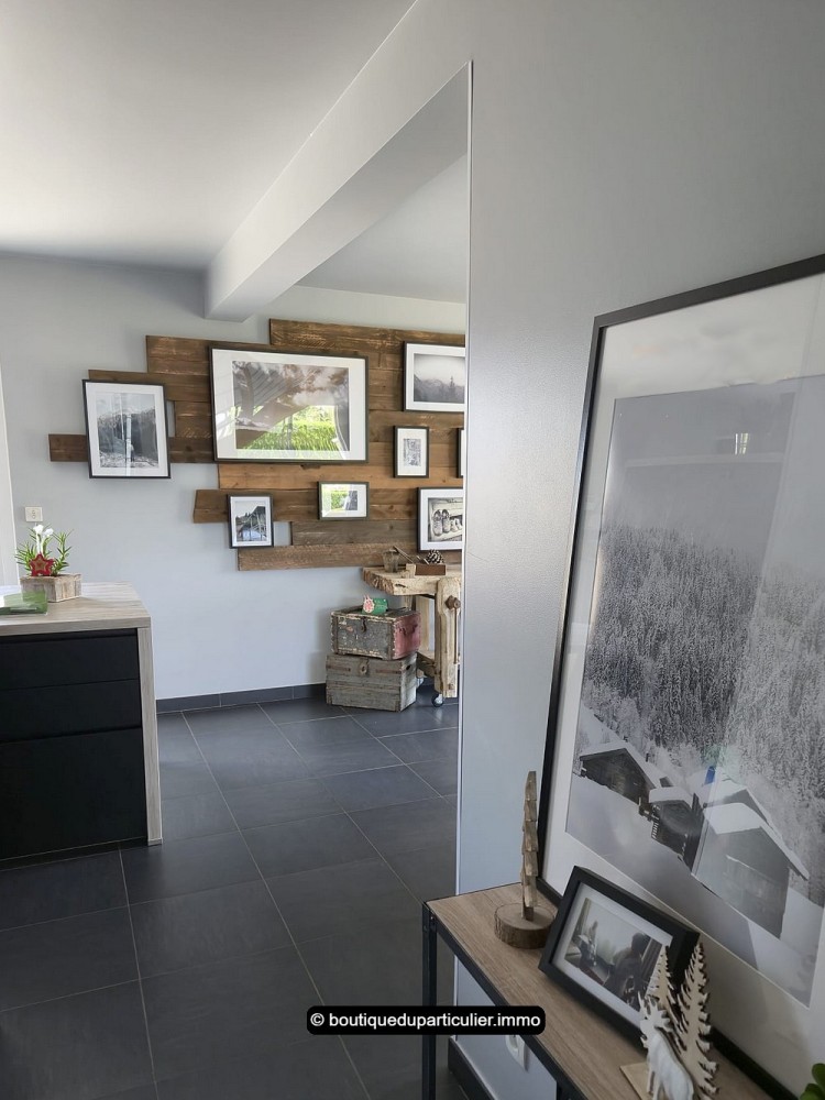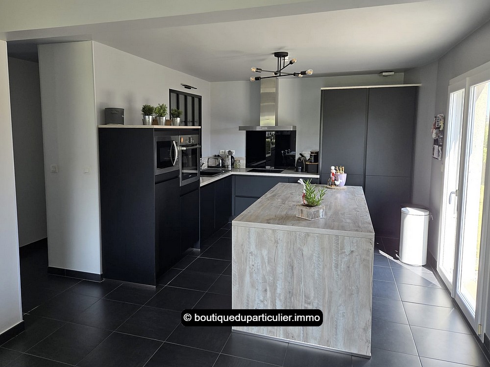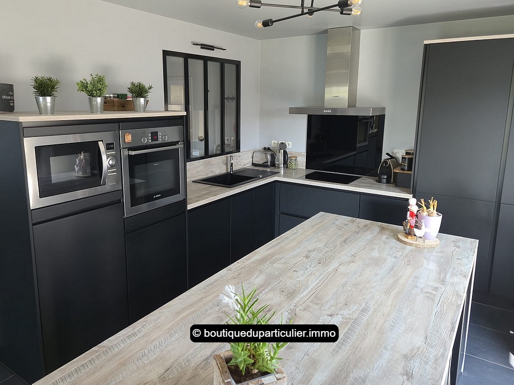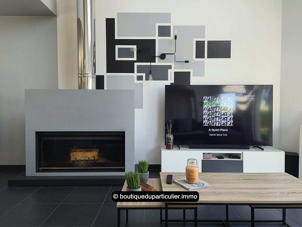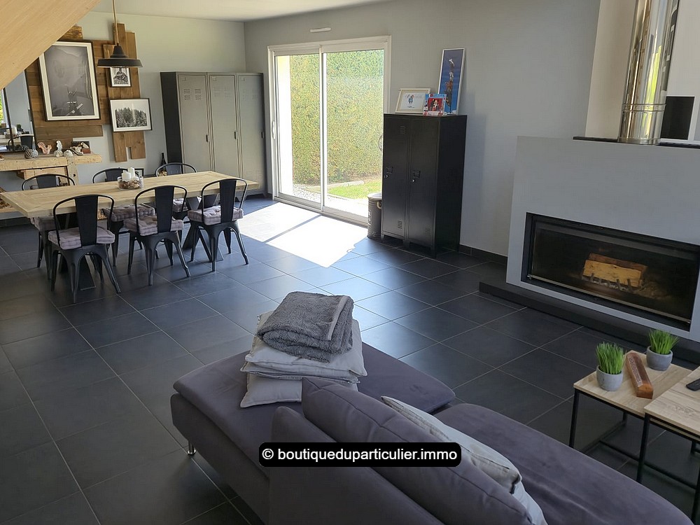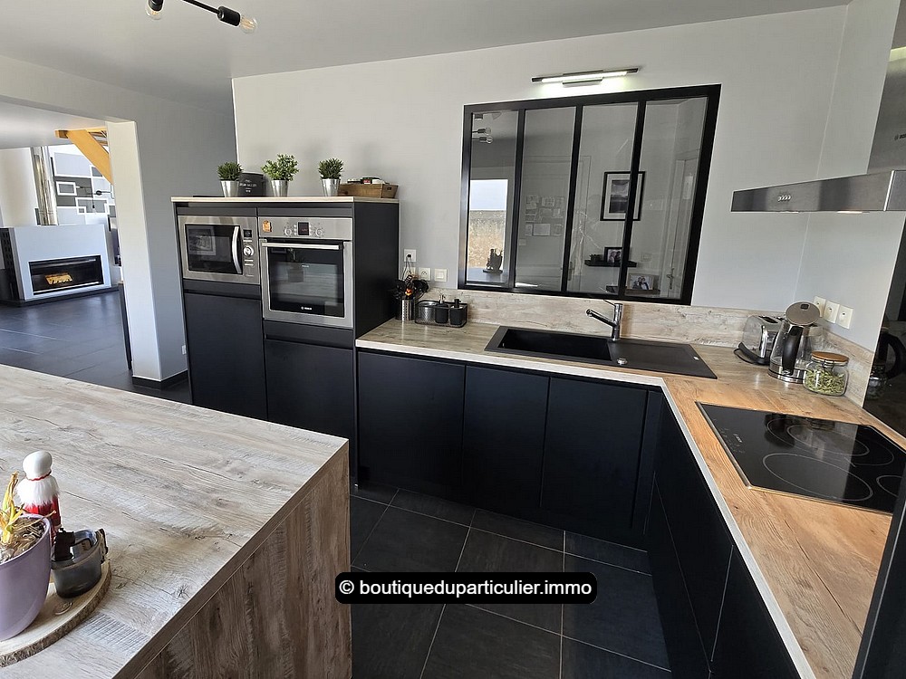 L’espace d'env. 70 m² est composé d’un salon avec poêle à bois moderne, d’un coin repas et d’une cuisine ouverte entièrement équipée, au design sobre et élégant, avec ilot central et électroménager récent encastré.