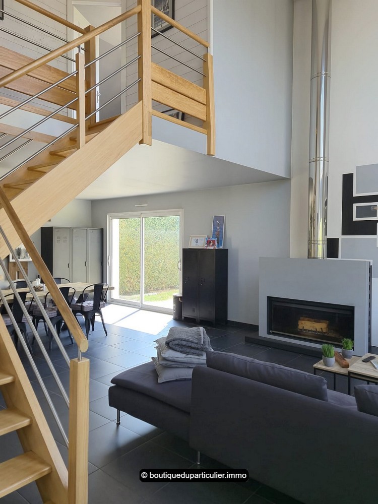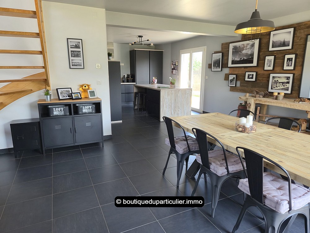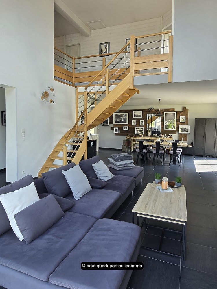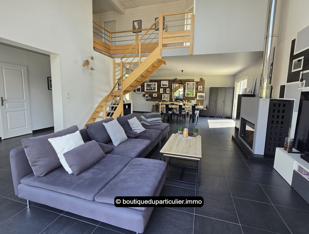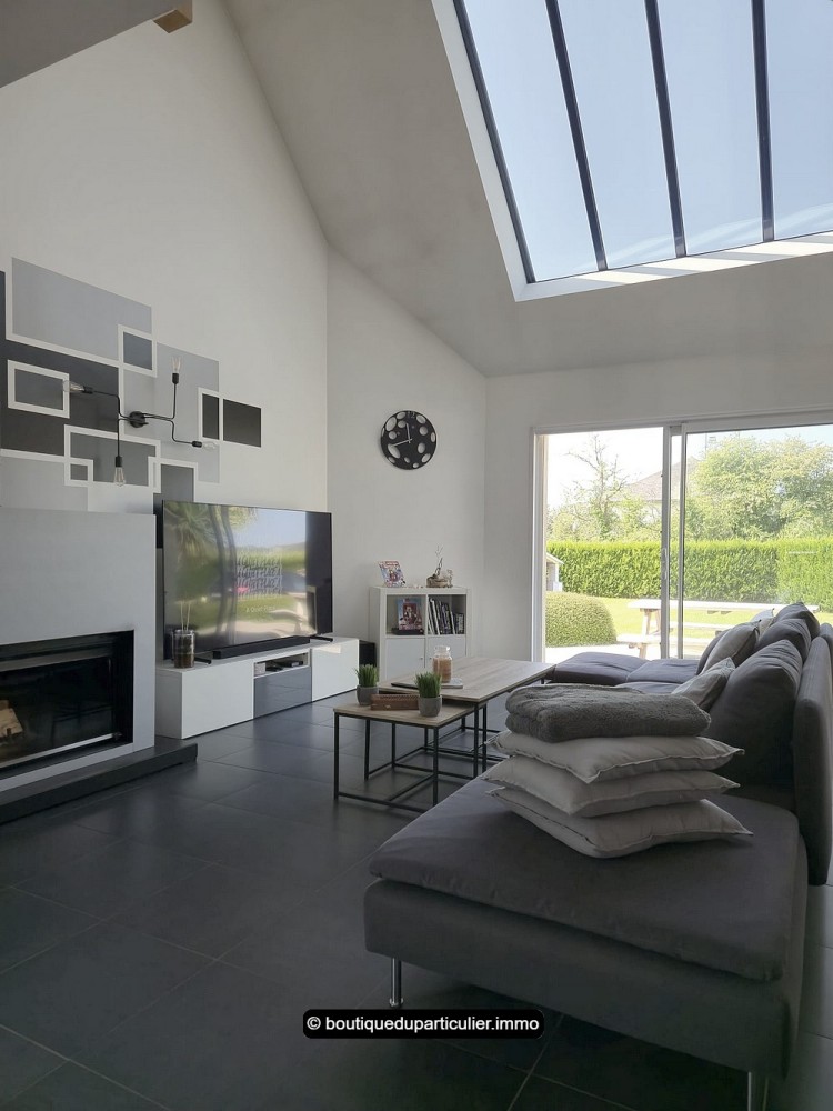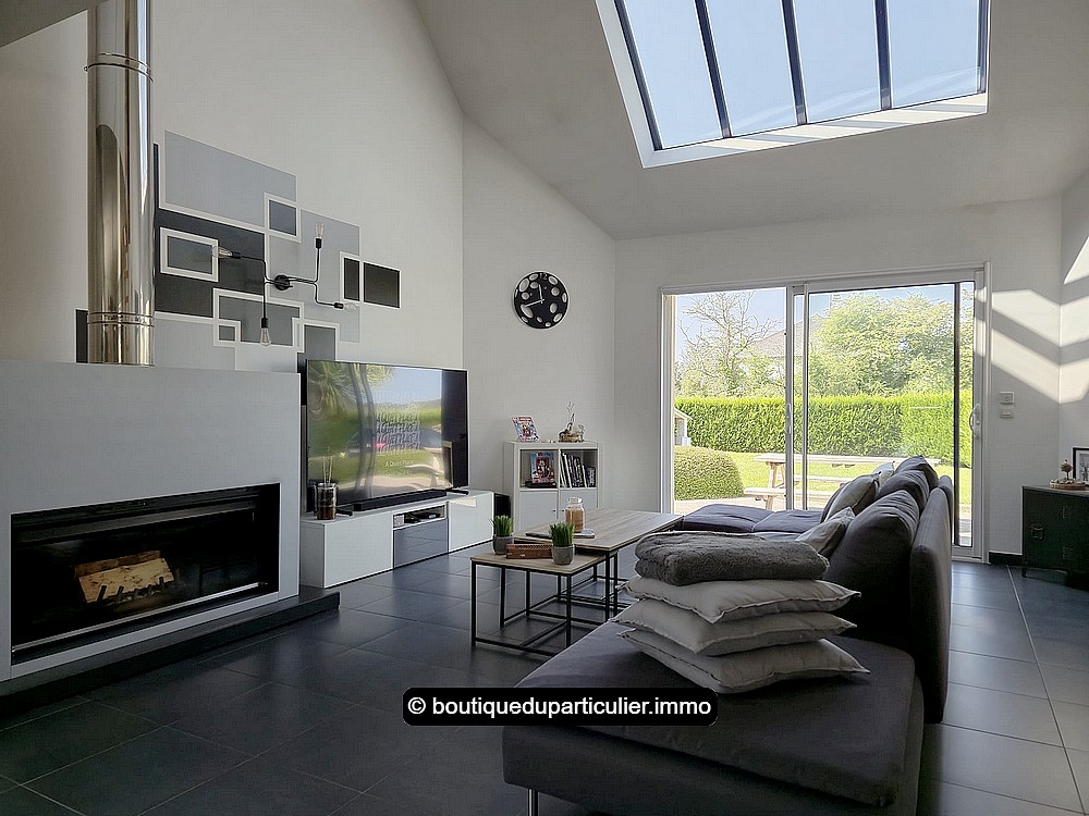 Dès l’entrée, vous serez séduit par cette superbe pièce de vie au volume généreux, baignée de lumière naturelle grâce à ses larges baies vitrées et son puits de lumière zénithal.