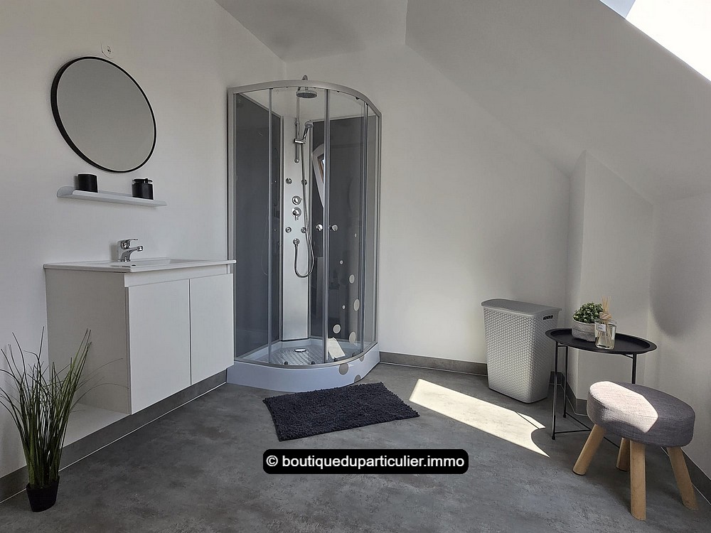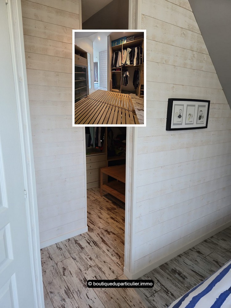 Un bel escalier central amène à l'étage ; il est composé d'une spacieuse mezzanine aménagée en bureau/coin détente, 3 belles chambres mansardées dont une avec sa pièce dressing, une seconde salle d'eau avec douche (possibilité baignoire), et un WC séparé.
