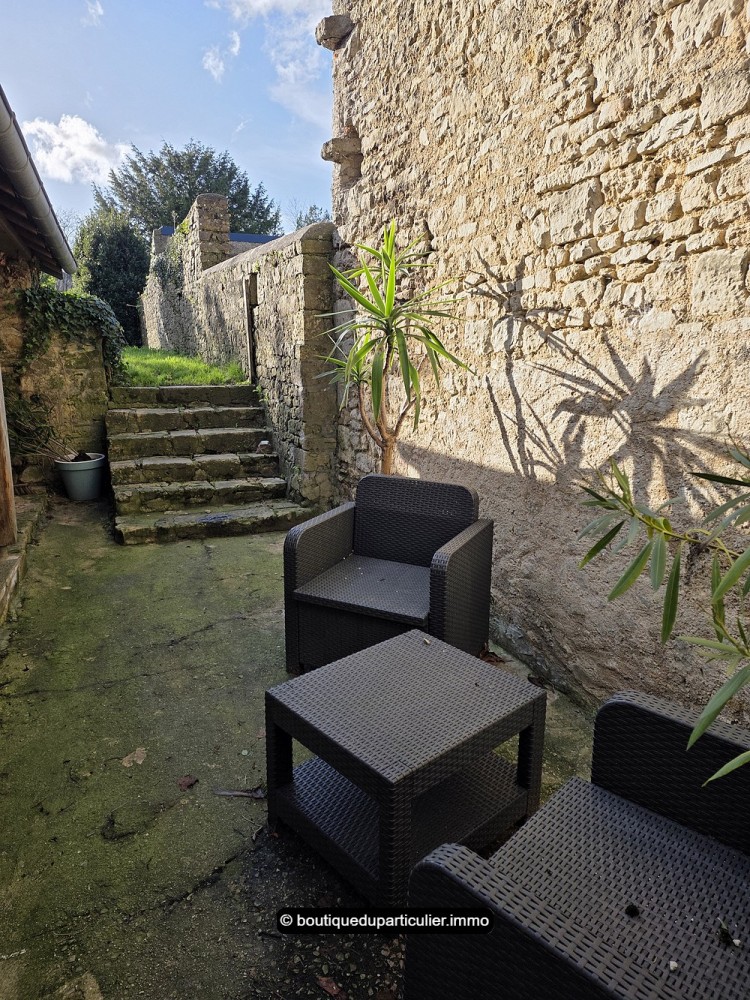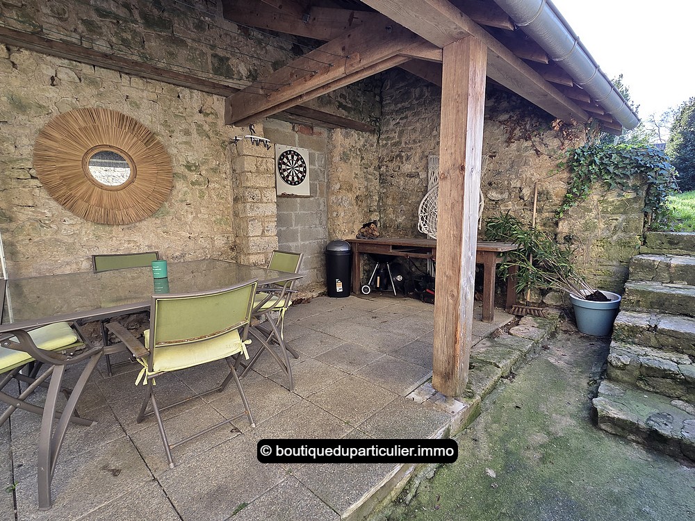 Sur l'arrière de la maison, vous trouverez un agréable patio clos de murs en pierres, avec une terrasse et un préau.
