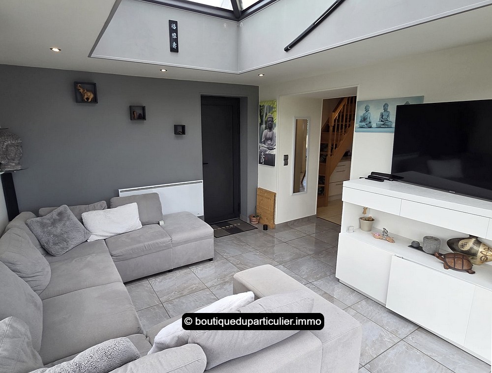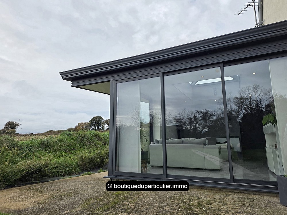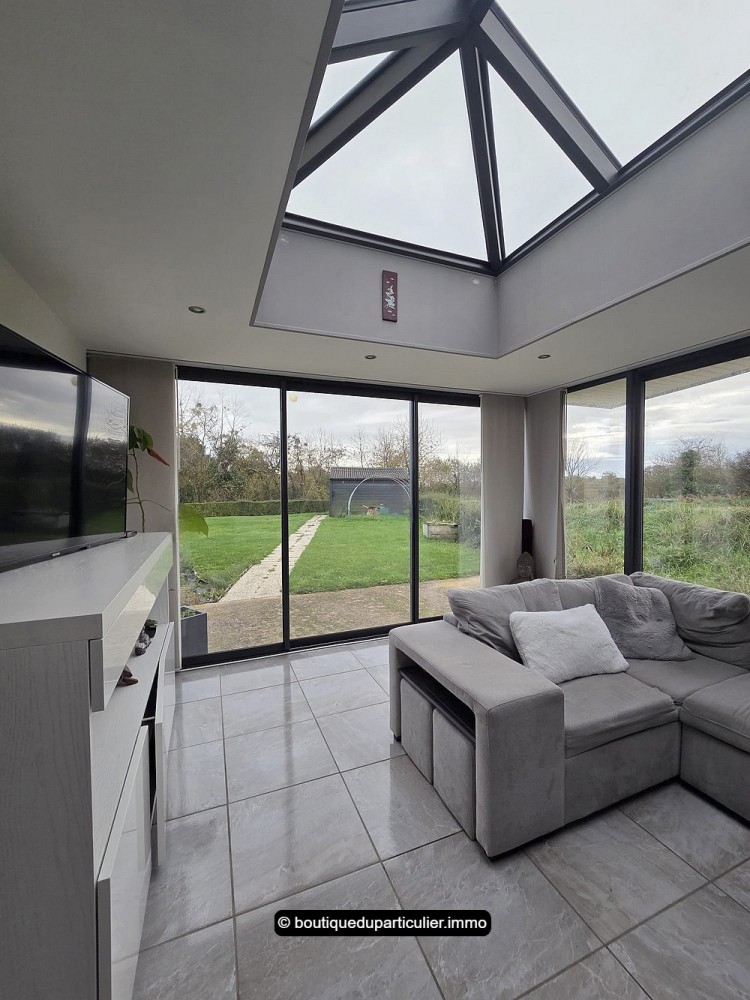 A la suite, une belle extension moderne a été créée il y a une dizaine d'années, aménagée en un cosy salon de presque 20 m² ouvert sur le jardin et baigné de soleil avec sa large baie d'angle et avec son puits de lumière vitré.
